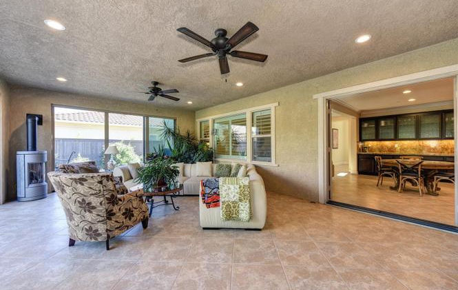 Custom upgrades abound in this Serrano Country Club home with 24 hour guard gated security. The foyer boasts imported Italian tiles which continue throughout the main floor living areas, all walls and ceilings have additional insulation, and plantation shutters have been added. You won't believe the GORGEOUS completely enclosed Serrano room, adding 384 sq ft of additional living space, with programmable Swedish soapstone fireplace and stackable glass doors that welcome the outdoors into the home regardless of the season. Extensive furniture grade cabinetry is featured in the stylish butler's pantry with wine storage and magnificent chef's kitchen with walk-in pantry, center island with sink and bar seating, glass tile backsplash and individual under counter lighting. The downstairs bedroom with adjacent bath opens into the Serrano room through double French doors. Ascend to the upstairs loft area, two additional bedrooms, bath, laundry room and master suite with dual walk-in closet